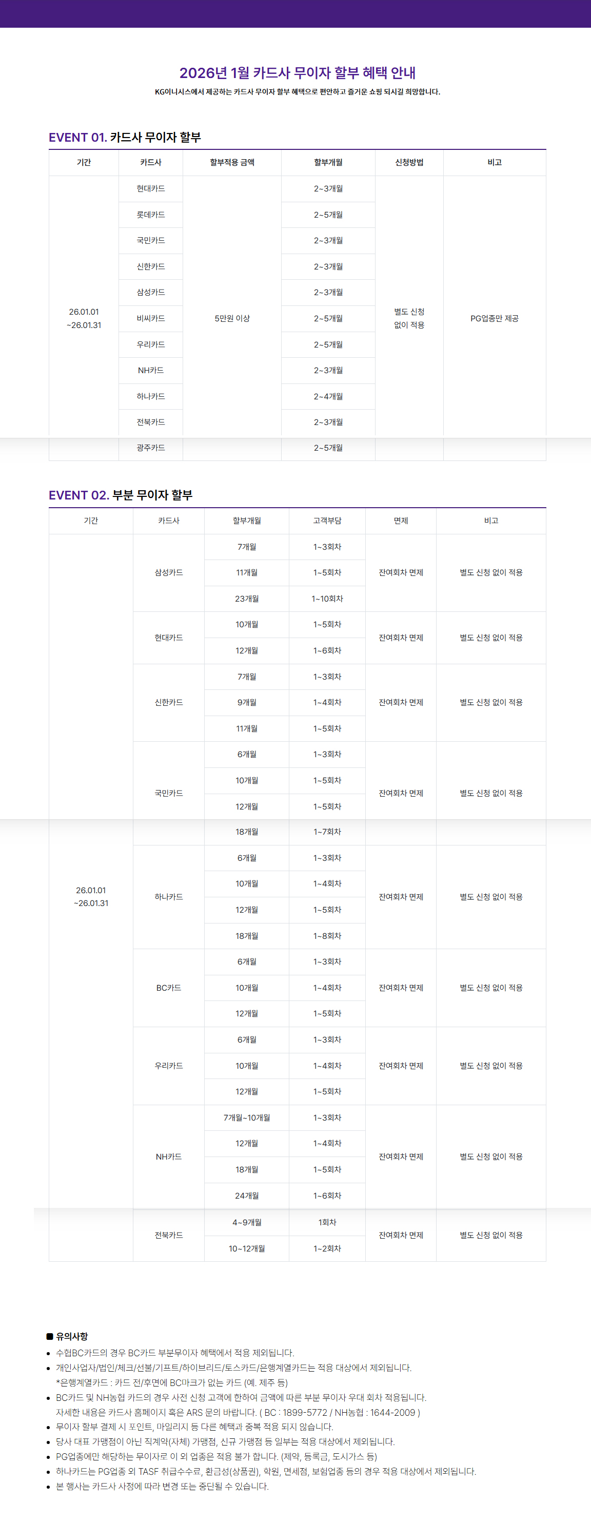 2026년 01월 카드사 무이자 할부 혜택 안내