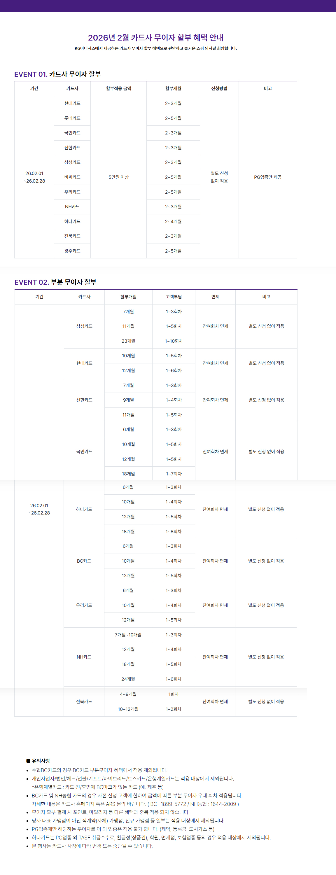 2026년 02월 카드사 무이자 할부 혜택 안내