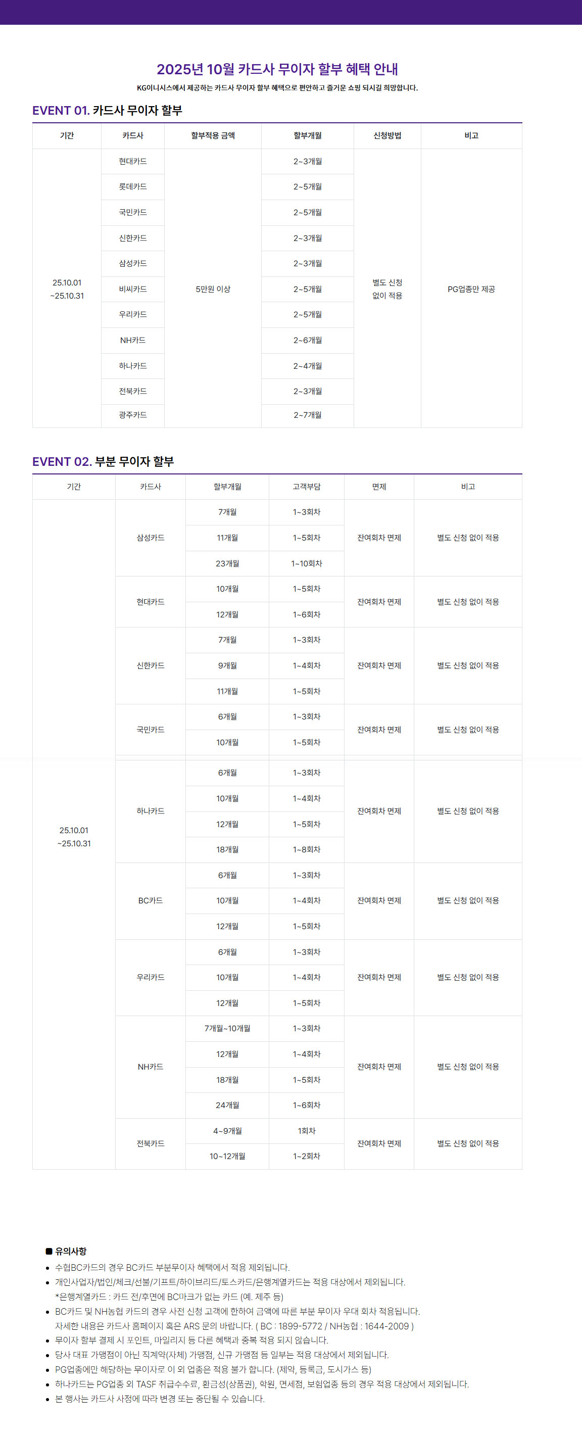 2025년 10월 카드사 무이자 할부 혜택 안내