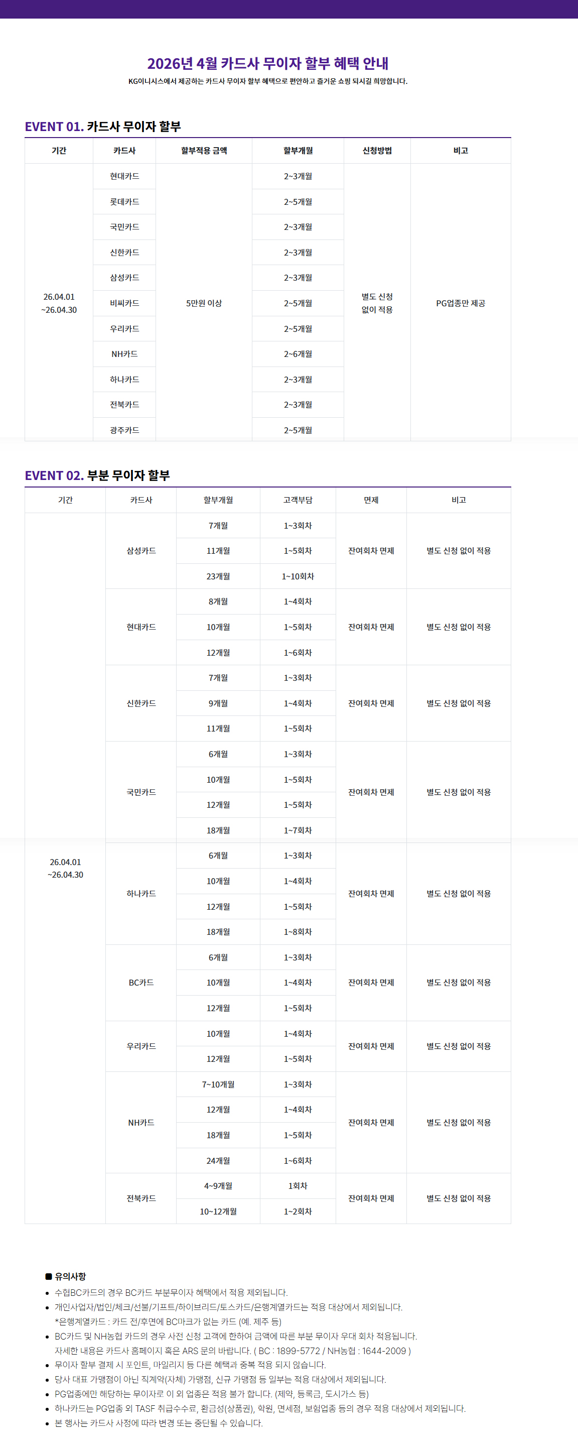2026년 04월 카드사 무이자 할부 혜택 안내